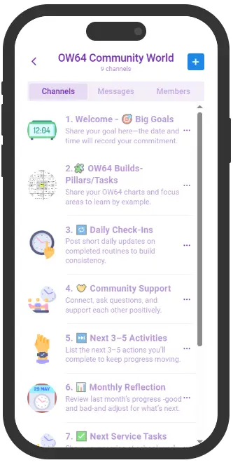 The OW64 Community is made up of nine focused channels, each designed to inspire, encourage, and motivate—nothing more, nothing less. This is a space that supports self‑reliance, where you take responsibility for your growth while receiving positive reinforcement from others walking a similar path.